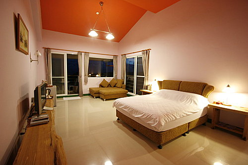 寬敞的VIP雙人房,採用紫色調,珊瑚桔搭配, 以百年香柏作床頭桌、電視枱,讓室內充滿自然香氣。